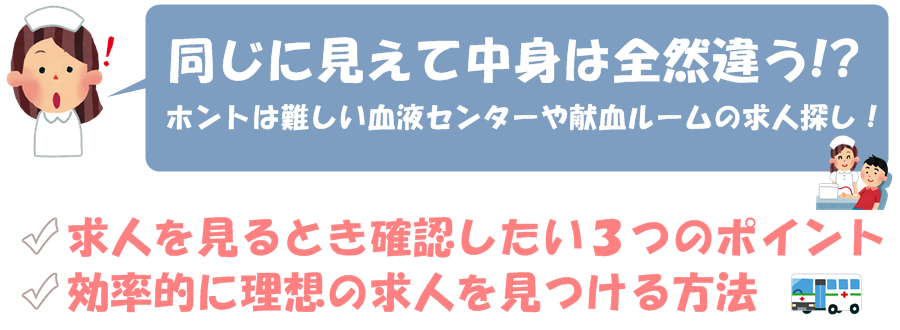 また、「どうしても献血に関わりたい!」というのではなく、「夜勤なしで働きたい」「医療行為のリスクが少ない職場で働きたい」「穏やかな職場環境で働きたい」という希望があって献血の仕事が気になっているのであれば、他の職場も必ずチェックしておきましょう。